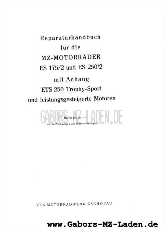 MZ ES 175/2, 250/2, ETS 250 Trophy Sport Best.-Nr.: L438 Reparaturhandbuch Ausgabe 1972 als Kopie 15,00 € (inkl. MwSt., zzgl. Versand) Auf Lager