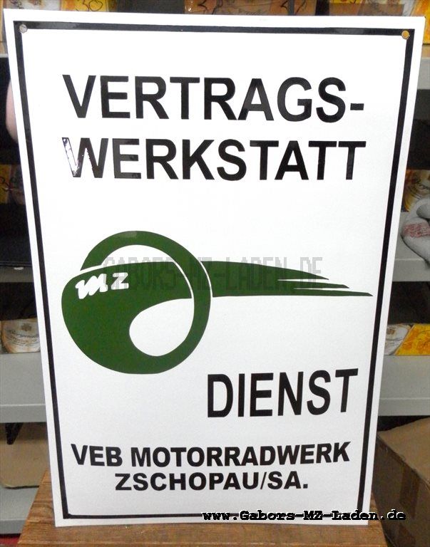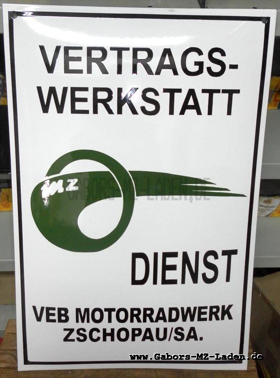 Emailleschild MZ Vertrags-Werkstatt Emailschild Best.-Nr.: MZ-Dienst Nachfertigung 249,99 € (inkl. MwSt., zzgl. Versand) Auf Lager