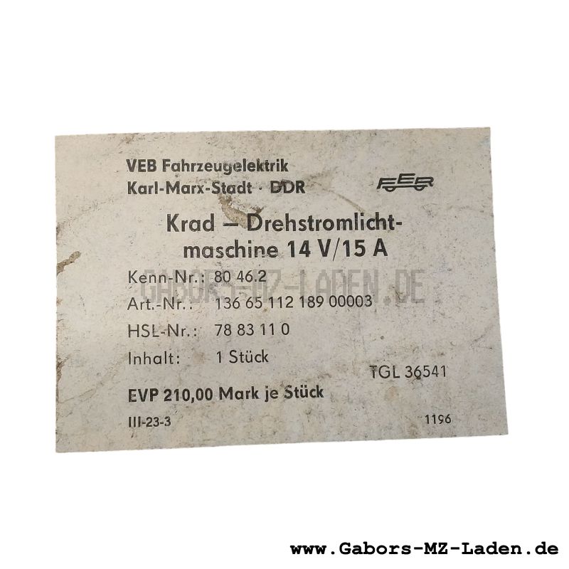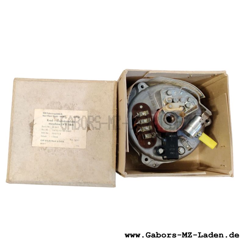 Alternator 8046.2 EL complete OrderNo.: 8046.2 EL Genuine spare Manufacturer: MZ - VEB Motorradwerk Zschopau, Neue Marienberger Straße 189c, DDR-9360 Zschopau, Telefon: Zschopau 440, Fernschreiber: 07427 CatalogueNo.: 8 275,00 € (incl. VAT, plus shipping) in stock